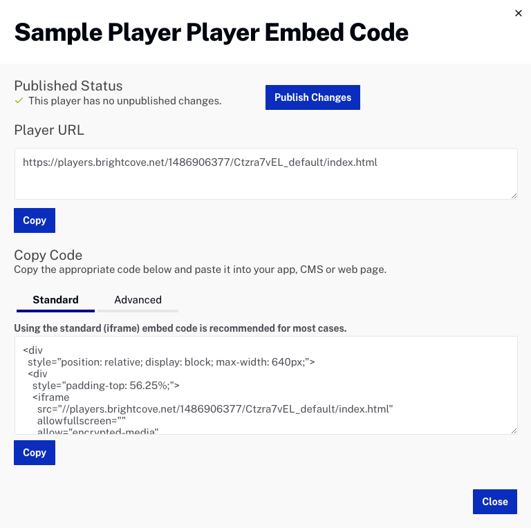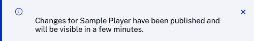 Publishing the player will push the changes to the published player. For more information on preview players, published players and player publishing code, see Generating Player Embed Code.