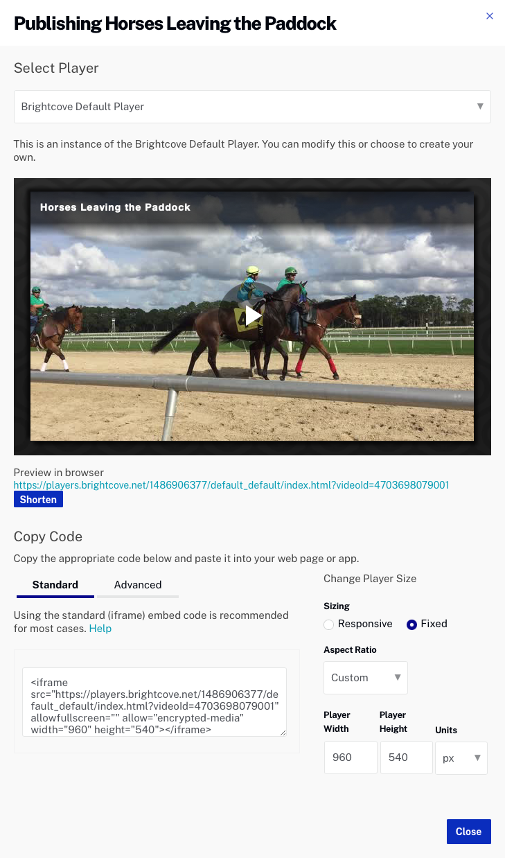 - (Optional) The preview link below the preview player can be used to preview the player in another browser tab. Click the Shorten button to generate a shortened URL.