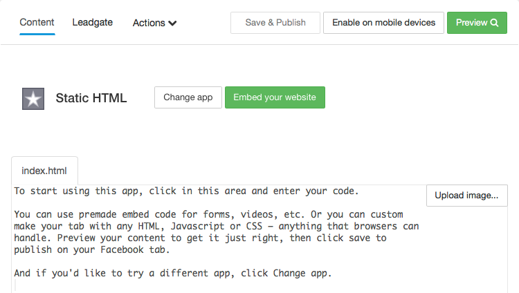 The process outlined below uses an application you add to your Facebook account. This application will create a tab on your Facebook page where you can then paste in static HTML that is displayed on that tab. Note that there are many other applications available that provide this functionality. The steps below assume you have a Facebook Fan Page. If not, you can go here to create one.