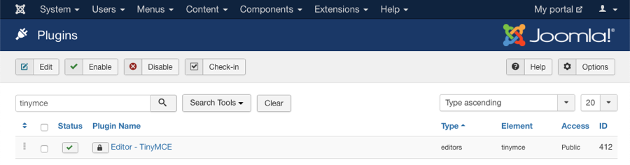 - Click on the Editor - TinyMCE plugin link to edit its settings.