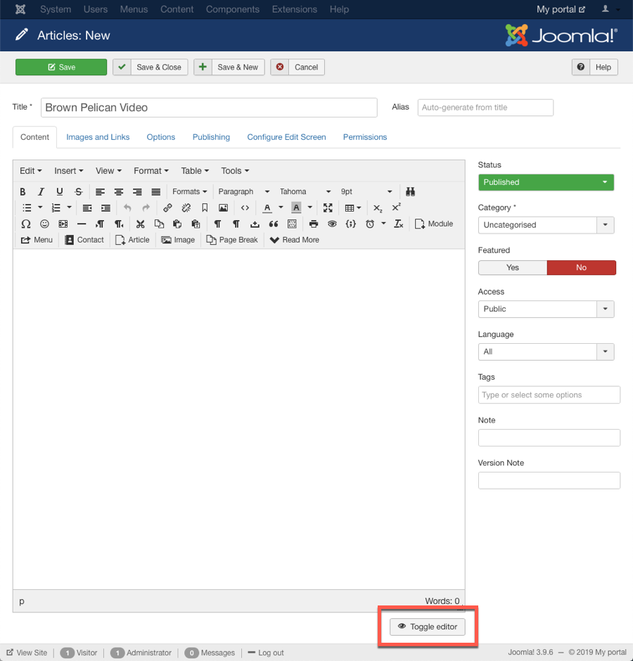 - Click the Toggle editor button at the bottom of the editor to go into HTML mode.