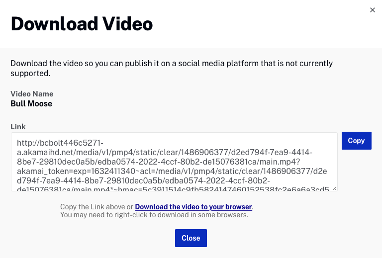 Brightcove Social provides the ability to copy the video URL or download a video source file. When downloading, the highest quality MP4 rendition will be downloaded. If there are no MP4 renditions, the Download link will be disabled.