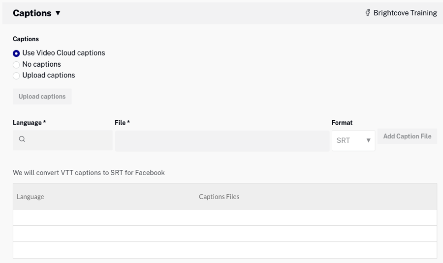 will be visible to viewers in the Facebook player via the 'Setting' menu and the 'Closed Captions' menu. We recommend that text track labels be set to something that will be meaningful to viewers. (For example, Labeling captions in different languages in those languages.) - No captions - No captions will be sent to YouTube