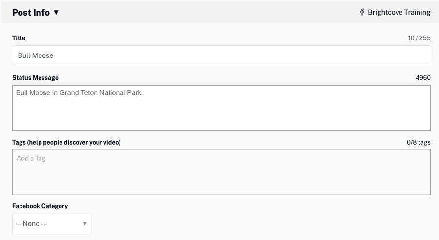 - Status Message - Description of the video (defaults to short description). Note that Facebook has disabled their search API, therefore, it's not possible for us to auto complete a Facebook mention.