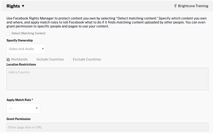 - Detect Matching Content - Check to enable Facebook rights management. For information, see the Facebook documentation.