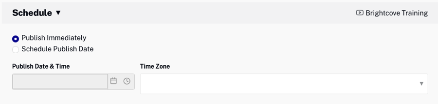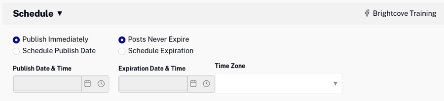 Click on the Schedule link. Select Publish Immediately to publish the video immediately or select Schedule Publish Date and select a Publish Date & Time. You can also set that Posts Never Expire or select Schedule Expiration and then select a Expiration Date and Time. A Time Zone can also be selected.