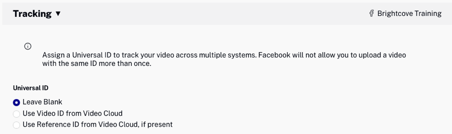 Click on the Tracking link to assign a universal ID to track the video across systems. The following Universal ID options are available: