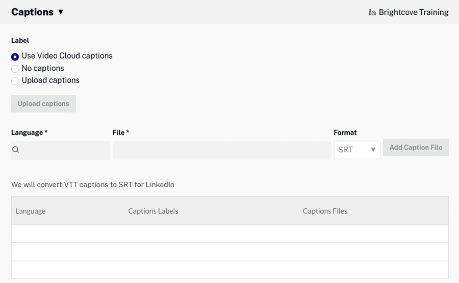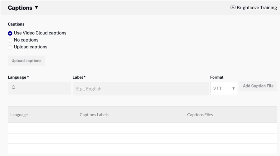 - Upload captions - Click Upload captions and browse and select a captions file. The captions file should be in .VTT or .SRT format. Select the caption Language, add a Label and select the Format. Click Add Caption File.