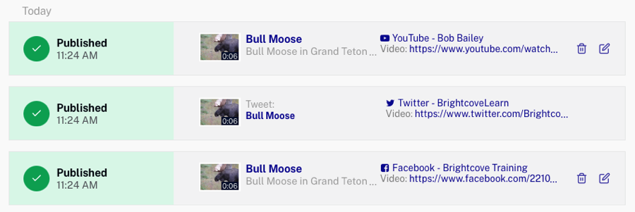 Brightcove Social allows you to easily publish videos in your account out to YouTube, Facebook and X (formerly Twitter). Before you can publish videos, you must create publishing destinations for the social accounts you wish to publish videos to. For information on creating publishing destinations, see Creating Social Media Publishing Destinations.