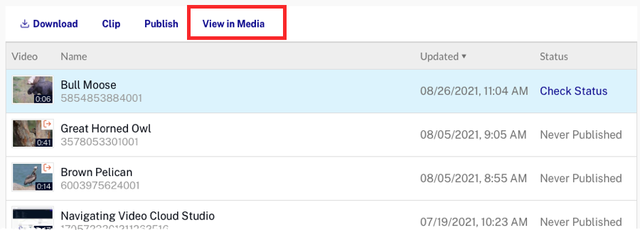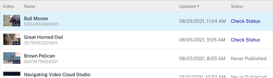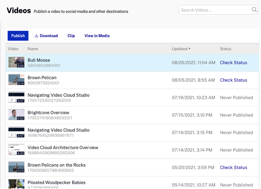 - Click Videos in the left navigation menu. A list of videos in your account will display. Videos that haven't been published to a social media account will display a Status of Never Published. Videos that have been published will display Check Status. Click the link to see the publishing status of the video on the social media destinations.