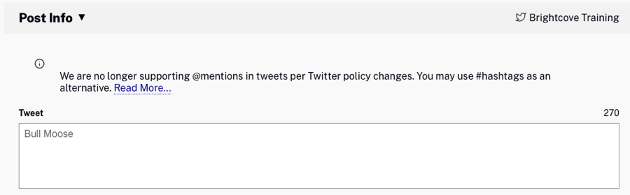 Click on the Post Info link and enter the Tweet content. Note that @mentions will be converted to #hashtags when being sent to X. For more information, see the blog post, Deprecation of X @mentions in Brightcove Social.