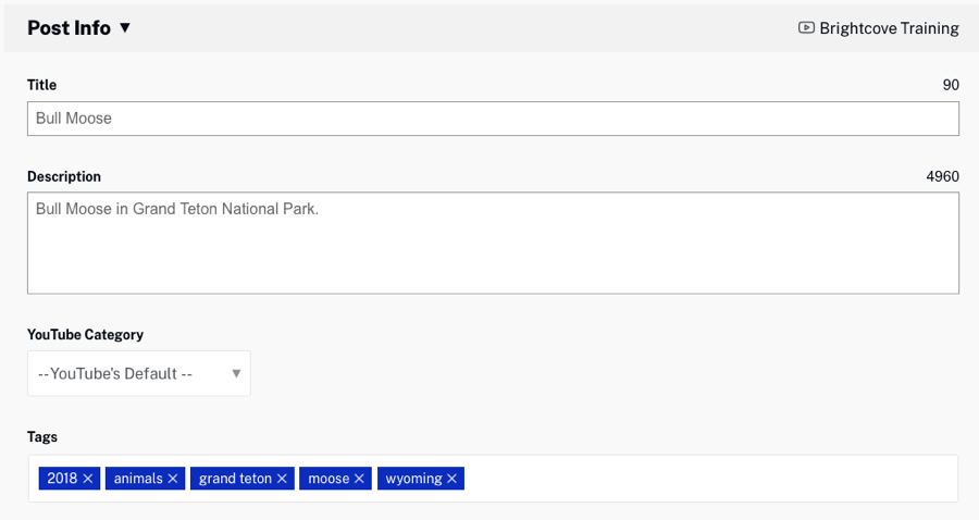 - Tags - Tags for the video (defaults to tags). There's no specific tag count limit; you can use max 30 characters per tag, and the text field accepts up to 500 characters.