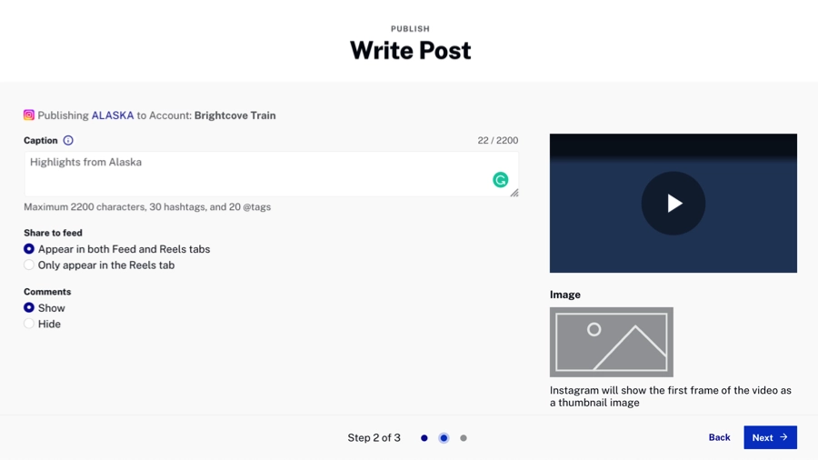 - Caption - Write a caption for the image, video, or carousel: maximum of 2200 characters, 30 hashtags, and 20 tags.