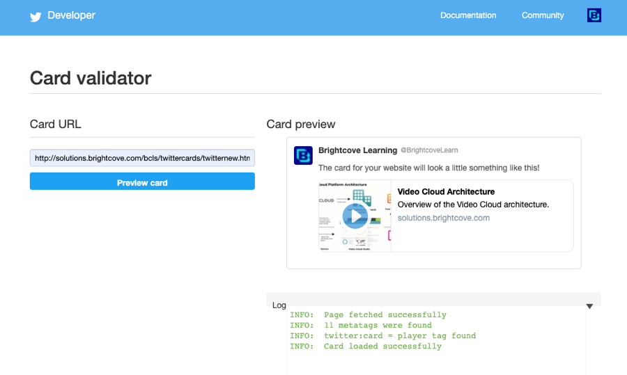 If your domain has not been whitelisted by X, the Player Cards will not appear. When validating the URL, a message will appear stating that the URL has not been whitelisted. For more information on the approval process, see the X documentation.