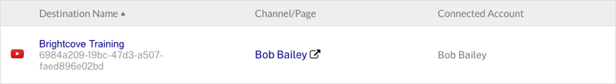 Click the Destination Name to edit the destination. Click the link in the Channel/Page column to open the YouTube channel in another browser tab.