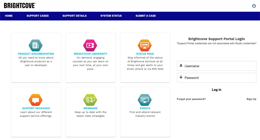 - Log in to the Brightcove Support Portal at https://supportportal.brightcove.com.